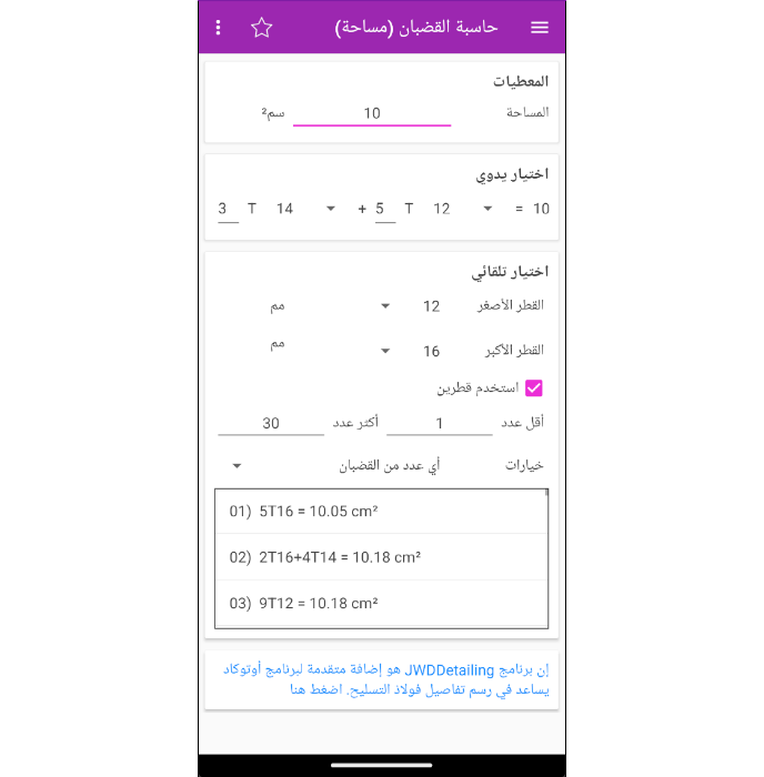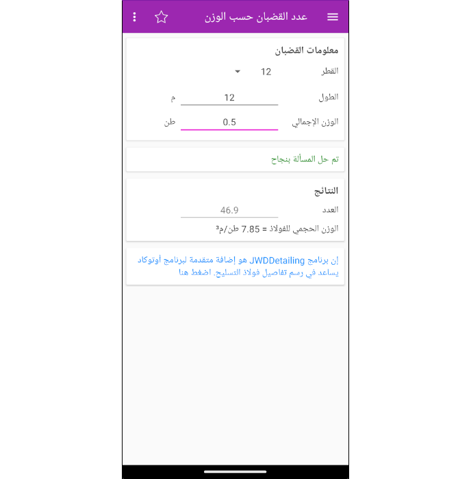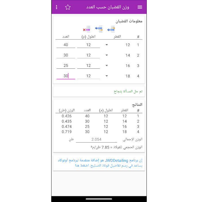 نقوم أولاً بتحديد قطر قضيب التسليح وطوله والوزن الإجمالي، فيقوم البرنامج بحساب العدد.