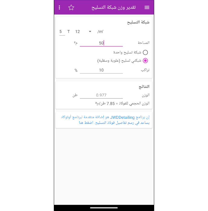عن طريق هذه الأداة نستطيع تقدير وزن الفولاذ اللازم لشبكة حديد تسليح بلاطة أو أرضية عن طريق تحديد قطر القضبان وعدد هذه القضبان في المتر الطولي في كل اتجاه، ومساحة البلاطة أو الأرضية، كما نحدد فيما إذا كانت الشبكة بطبقة واحدة أو طبقتين.