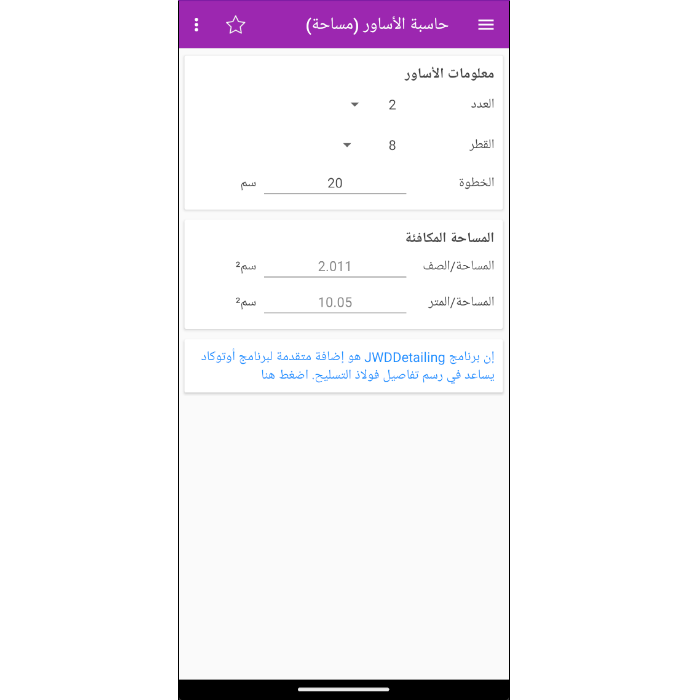 عن طريق هذه الأداة نستطيع حساب المساحة المكافئة للأساور في الجوائز في الصف الواحد من الأساور أو في المتر الطولي من الجائز (أي باعتبار المسافة بين صفوف الأساور تساوي 1 متر)
