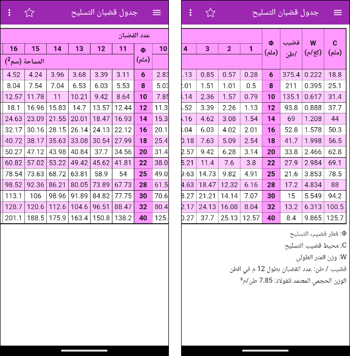 هذه الأداة هي عبارة عن جدول يظهر محيط قضيب التسليح ووزنه الطولي وعدد القضبان في الطن، بالإضافة إلى مساحة مقطع عدد معين من القضبان، كل ذلك حسب القطر.