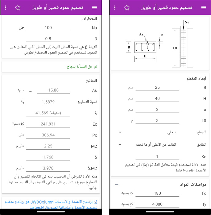- وفي حال كان العمود طويلاً يتم إظهار بعض العوامل الناتجة عن علاقات حساب العمود الطويل كعامل المرونة وقوة أولر والعزم الافتراضي وعامل تكبير العزم...إلخ وتستخدم هذه الأرقام لتدقيق النتيجة.