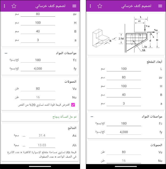 - المقاومة المميزة للخرسانة، وإجهاد خضوع الفولاذ، ويقوم البرنامج تلقائياً بحساب إجهاد الخضوع المخفض).