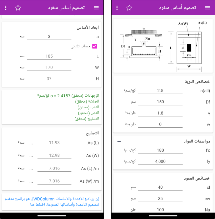 عند تعديل أي قيمة يقوم البرنامج بحساب أبعاد الأساس (إن كان خيار الحساب التلقائي مفعلاً)، ويقوم بعملية التحقيق التي تشمل (تحقيق الإجهاد، وتحقيق الصلابة وتحقيق الثقب، وتحقيق القص)، كما يقوم بحساب التسليح اللازم لمقاومة العزم في الاتجاهين.