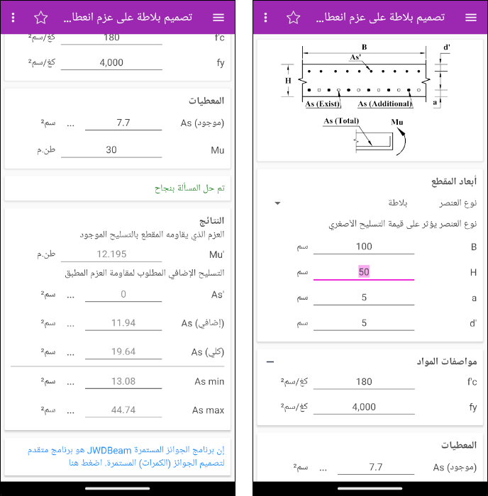 - مواصفات المواد (المقاومة المميزة للخرسانة، وإجهاد خضوع الفولاذ، ويقوم البرنامج تلقائياً بحساب إجهاد الخضوع المخفض).