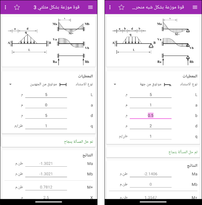 بعد أن نقوم باختيار الأداة المطلوبة حسب شكل القوة (الحمولة) نحدد نوع الاستناد ثم نحدد الأطوال وقيمة الحمولة حسب ما هو موضح في الصورة التوضيحية لكل أداة.