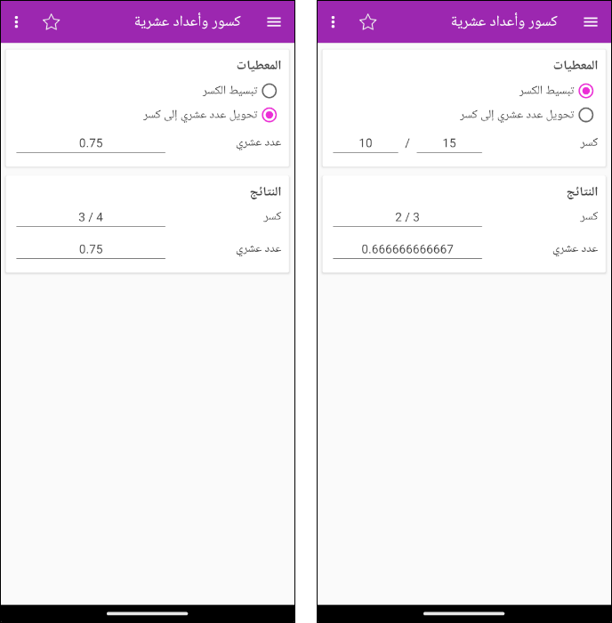- تحويل عدد عشري إلى كسر: حيث يقوم البرنامج بالبحث عن الكسر الذي تساوي قيمته هذا العدد العشري، أو تكون قريبة منه إلى دقة 1 إلى 10000