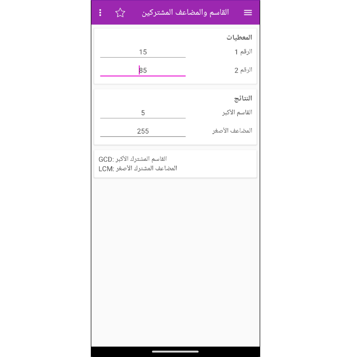 تقوم هذه الأداة بإيجاد القاسم المشترك الأكبر والمضاعف المشترك الأصغر لعددين صحيحين.