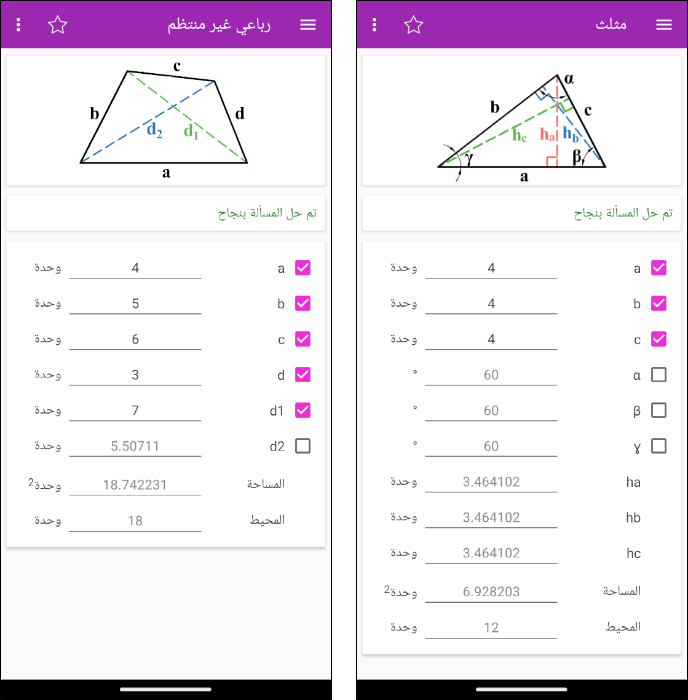 كل أداة تحوي في الأعلى صورة توضح الشكل الهندسي والأبعاد الخاصة به، وتحت هذه الصورة نقوم بإدخال بعض الأبعاد المطلوبة فيقوم البرنامج تلقائياً بحساب الأبعاد الأخرى بالإضافة إلى مساحة الشكل ومحيطه.
