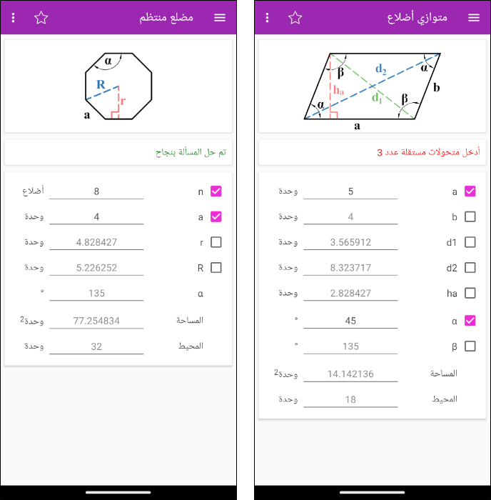 كل شكل من الأشكال الهندسية يحتاج إلى عدد مستقل من المتحولات، فبعض الأشكال تحتاج لإدخال بعدين اثنين وبعضها يحتاج ثلاثة وبعضها أكثر، ونقوم بتحديد الأبعاد المعلومة باختيارها، أما الأبعاد المجهولة نقوم بإلغاء اختيارها فيقوم البرنامج بحسابها.