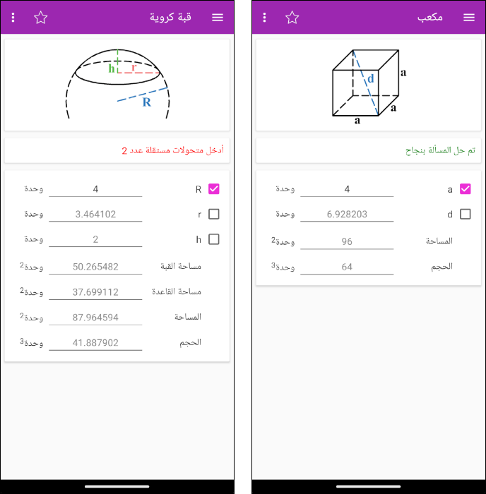 تستخدم أدوات هذا القسم لحساب حجم ومساحة سطوح بعض الأشكال الهندسية الفراغية الشهيرة، وتستخدم أيضاً لحساب بعض الأبعاد بناءً على أبعاد أخرى.