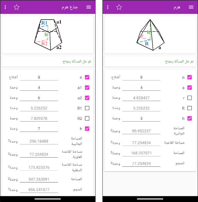 كل أداة تحوي في الأعلى صورة توضح الشكل الهندسي والأبعاد الخاصة به، وتحت هذه الصورة نقوم بإدخال بعض الأبعاد المطلوبة فيقوم البرنامج تلقائياً بحساب الأبعاد الأخرى بالإضافة إلى حجم الشكل ومساحة سطحه.
