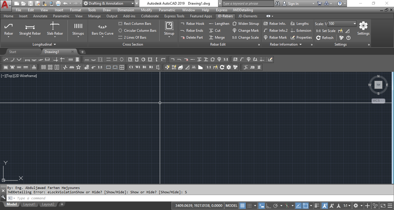 بعد انتهاء عملية التثبيت، وبعد تشغيل برنامج أوتوكاد تظهر مجموعتي أوامر جديدة ضمن شريط أواومر أوتوكاد، اسم المجموعة الأولى JD-Rebars واسم الثانية JD-Elements تحويان أوامر البرنامج كما هو مبين في الصورة.